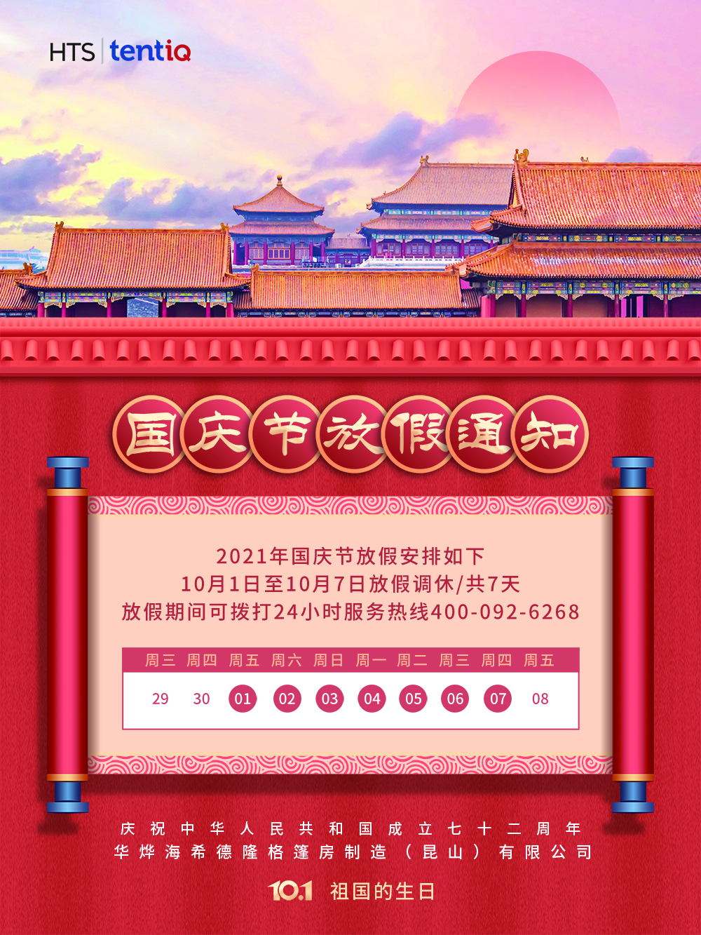 感謝大家一直以來對華燁篷房的大力支持與厚愛,國慶節將至,結合公司實際情況,現將2021年國慶節安排通知如下:10月1日至7日放假調休共7天,10月8日至9日(周五、周六)上班。在此期間想了解篷房相關知識和報價方案的可以直接撥打華燁海希德隆格篷房制造(昆山)有限公司24小時服務熱線400-092-6268。